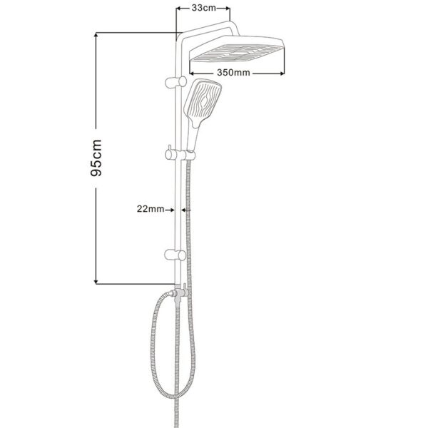Đường kính: 110x140mm, dài 260mm. Thiết kế với nút nhấn chuyển đổi chế độ nằm ngay trên mặt sen.