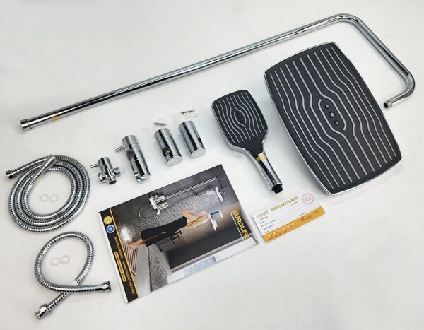 Bộ sản phẩm bao gồm : 1 ống dẫn cây sen, 1 đài sen lớn, 1 tay sen, 1 dây sen 150cm, 1 van chia nước, 1 dây cấp nước dài 50cm, 1 bát trượt tay sen, 2 bát gắn đỡ ống cây sen ( kèm tackle, ốc vít), 1 sách hưỡng dẫn sử dụng kèm phiếu bảo hành. (Không kèm cattalogue)