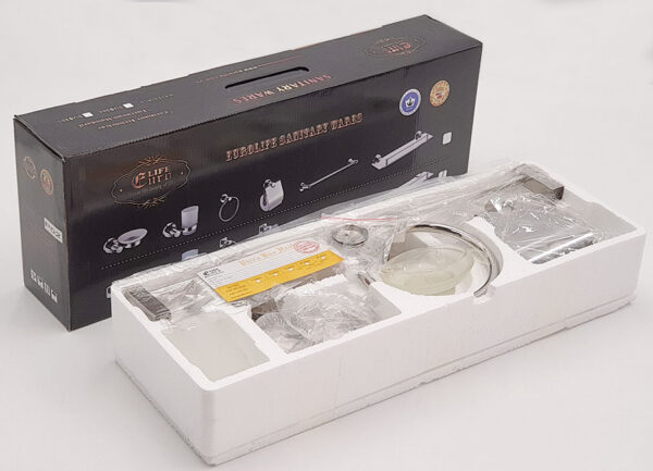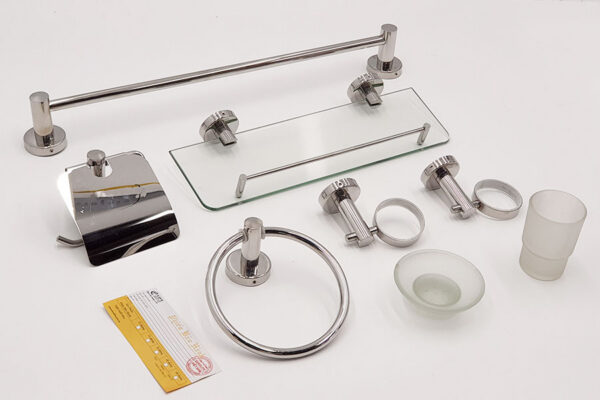 * Bộ sản phẩm bao gồm : 1- Kệ gương 2- Máng treo khăn đơn 3- Gía để ly 4- Gía để khay xà bông 5- Móc treo giấy 6 – Vòng treo khăn tắm