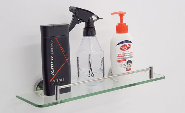 Kích thước : 395x115mm Kệ kinh cường lực dày 7mm Thanh chắn và bát treo bằng Inox SUS 304