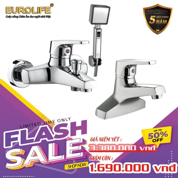 COMBO Eurolife EL-IRIS01 Chrome-plated Brass Hot and Cold Shower Faucet + EL-IRIS03 Double-legged Hot and Cold Lavabo Faucet (Silver White)
