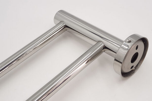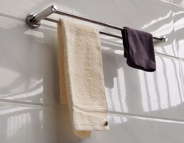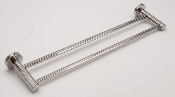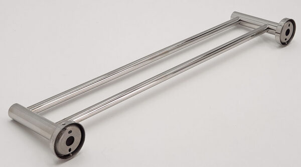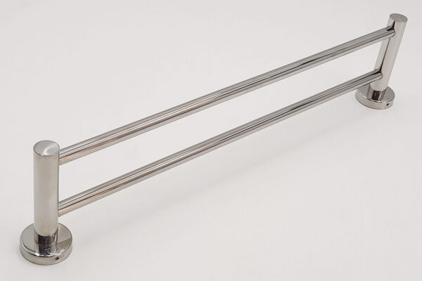 The towel rack is designed with a double trough and round posts. The main post is large, up to 25mm in diameter, and can withstand high loads.