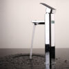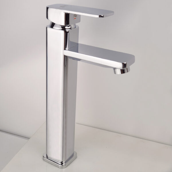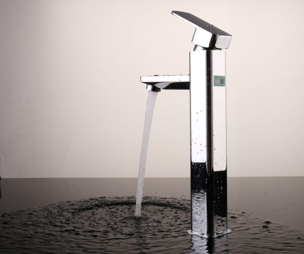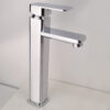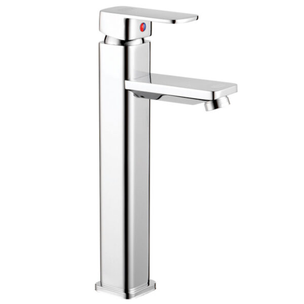 The tall faucet body with its rounded design, combined with a square spout, creates a robust and elegant feel for the bathroom.