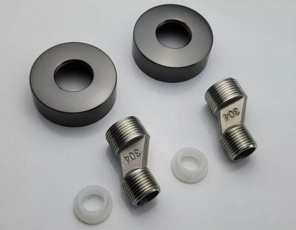 The pedestal is cast from SUS 304 stainless steel and CNC machined for sharp, durable, and easy installation. It comes with two stainless steel cover plates in a gray color matching the faucet body, and two heat-resistant double-layer rubber gaskets.