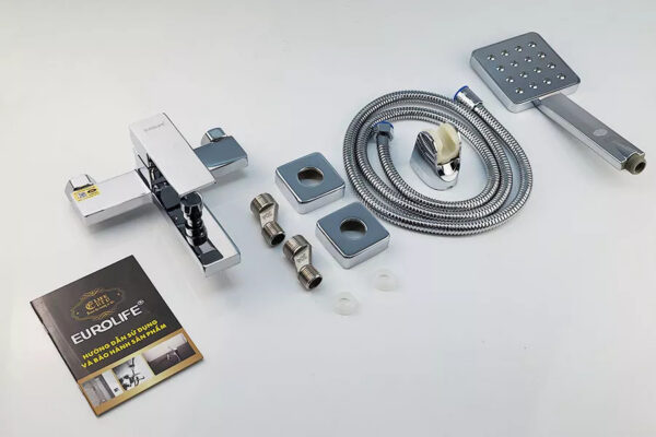 This product comes with the Eurolife EL-121SH super-pressure shower head and hose set. * Shower head material: ABS plastic with chrome plating. * 150cm long stainless steel shower hose with chrome plating. * 1 flow mode with powerful pressure boosting function. * Adjustable swivel holder for directing the flow.