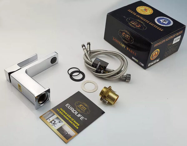 The complete product set includes: 1- Lavabo faucet body 2- Set of 2 SUS 304 stainless steel hoses, 1 mounting bracket, 2 rubber gaskets 3- User manual and warranty card