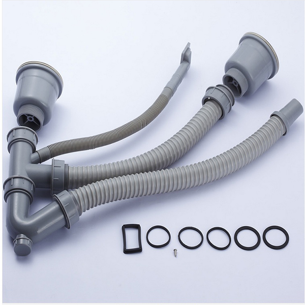 The drain kit comes with two SUS 304 stainless steel filter housings with sharp, stainless steel 304 strainers. The sizes are 110mm for the small compartment and 140mm for the large compartment, ensuring quick drainage. The drain kit includes sufficient drainage hoses for the small waste bin.