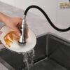 The hose rotates 360 degrees, directing the water flow wherever needed. The 360-degree rotating hose can be fitted to the faucet body and can be used with a water tap handle on the left, right, or front of the faucet.