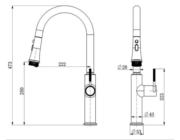 The large, tapered round pipe follows the contours of the faucet body. With a height of up to 473mm, it’s suitable for large kitchens and provides a powerful water flow.