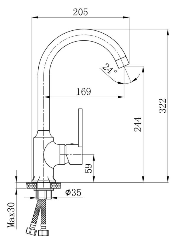 The round pipe, with a height of up to 240mm and a diameter of 24mm, ensures a high-reaching faucet and a strong water flow.