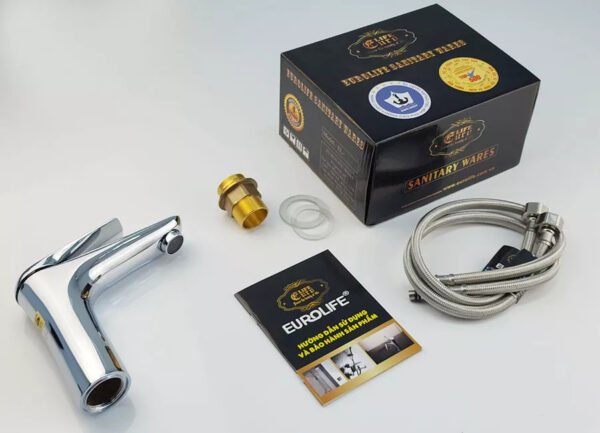 The complete product set includes: 1- Lavabo faucet body 2- Set of 2 SUS 304 stainless steel hoses, 1 mounting bracket, 2 rubber gaskets 3- User manual and warranty card