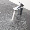 The tall faucet body with its rounded design, combined with a square spout, creates a robust and elegant feel for the bathroom.