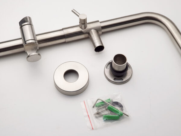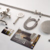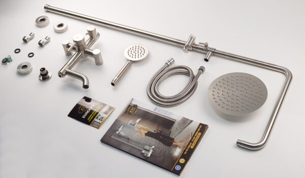 The product set includes: 1 shower head, 2 shower pipes, 1 large shower base, 1 hand shower, 1 150cm shower hose, 1 hand shower slide bracket, 1 shower pipe support bracket (with tackle and screws), 2 pedestals, 2 stainless steel end caps, 2 rubber gaskets for the pedestals and 1 rubber gasket for the shower pipe connector, 1 user manual and warranty card.