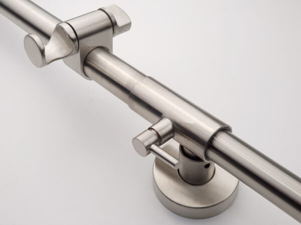 The support bracket is secured to the shower head pipe using a connector with two hexagonal screws.