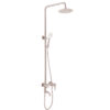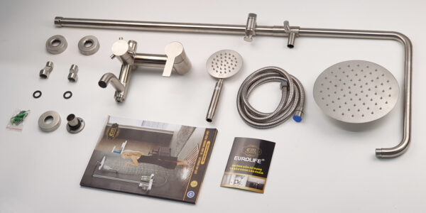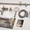 The product set includes: 1 shower head, 2 shower pipes, 1 large shower base, 1 hand shower, 1 150cm shower hose, 1 hand shower slide bracket, 1 shower pipe support bracket (with tackle and screws), 2 pedestals, 2 stainless steel end caps, 2 rubber gaskets for the pedestals and 1 rubber gasket for the shower pipe connector, 1 user manual and warranty card.
