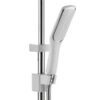 The shower head holder is designed to slide along the pipe with a push button, allowing for height adjustment to suit the user.