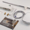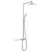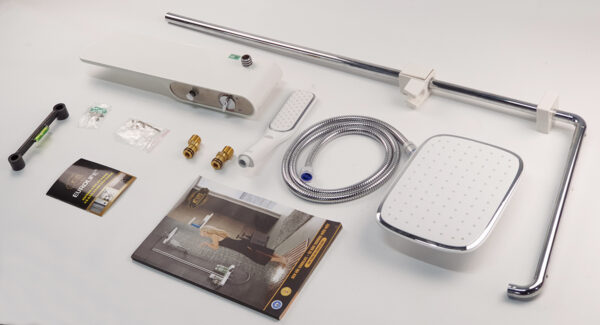 The product set includes: 1 shower head, 2 shower pipes, 1 large shower base, 1 hand shower, 1 150cm shower hose, 1 hand shower slide bracket, 1 shower pipe support bracket (with tackle and screws), 2 pedestals, 2 stainless steel end caps, 2 rubber gaskets for the pedestals and 1 rubber gasket for the shower pipe connector, 1 user manual and warranty card.