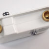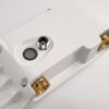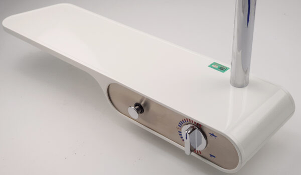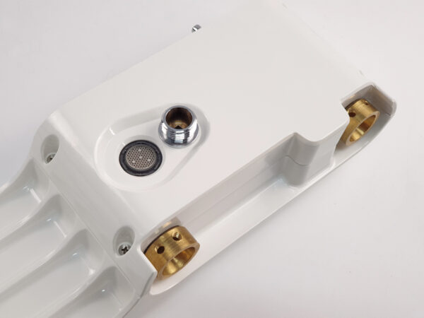 The faucet body is designed with a strong, curved shape. The water inlet handle and mode selector knob are conveniently located on the front of the faucet. The perfect design features a copper core combined with a milky white ABS plastic casing and a luxurious rose gold 304 stainless steel front panel.
