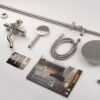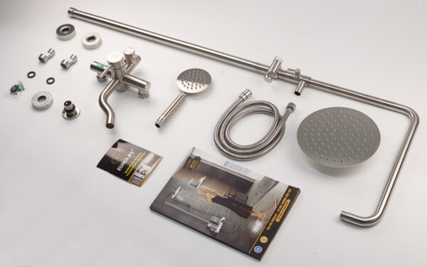 The product set includes: 1 shower head, 2 shower pipes, 1 large shower base, 1 hand shower, 1 150cm shower hose, 1 hand shower slide bracket, 1 shower pipe support bracket (with tackle and screws), 2 pedestals, 2 stainless steel end caps, 2 rubber gaskets for the pedestals and 1 rubber gasket for the shower pipe connector, 1 user manual and warranty card.