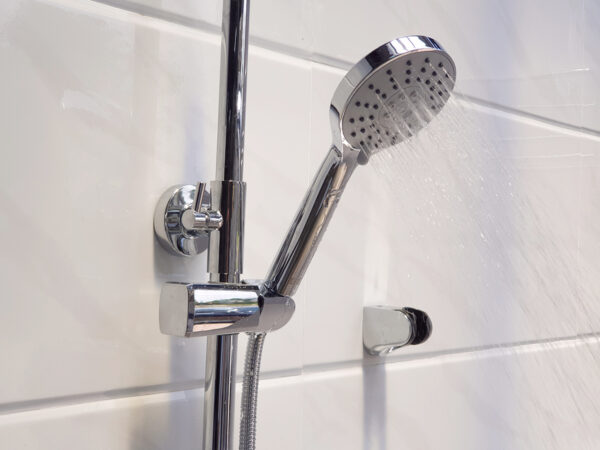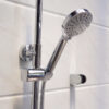 The shower head holder is designed to slide along the pipe with a push button, allowing for height adjustment to suit the user.