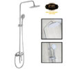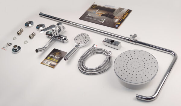 The product set includes: 1 shower head, 2 shower pipes, 1 large shower base, 1 hand shower, 1 150cm shower hose, 1 hand shower slide bracket, 1 shower pipe support bracket (with tackle and screws), 2 pedestals, 2 stainless steel end caps, 2 rubber gaskets for the pedestals and 1 rubber gasket for the shower pipe connector, 1 user manual and warranty card.