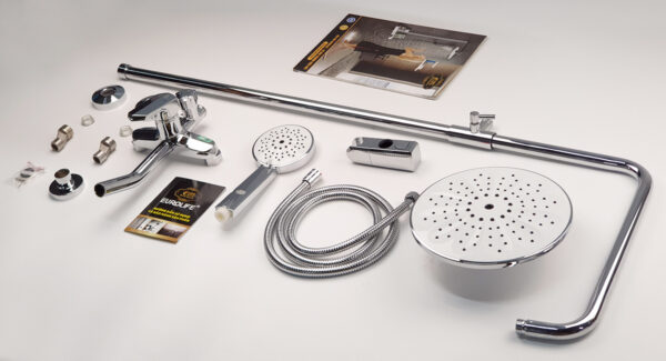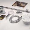 The product set includes: 1 shower head, 2 shower pipes, 1 large shower base, 1 hand shower, 1 150cm shower hose, 1 hand shower slide bracket, 1 shower pipe support bracket (with tackle and screws), 2 pedestals, 2 stainless steel end caps, 2 rubber gaskets for the pedestals and 1 rubber gasket for the shower pipe connector, 1 user manual and warranty card.