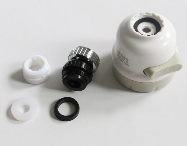 The nozzle comes with a threaded connector (white plastic) to convert to the appropriate thread size. The nozzle can be used with many different types of faucets.